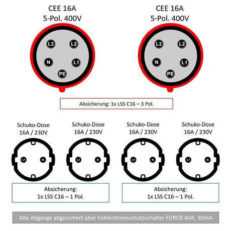 SANOS Wandverteiler ABB/PCE - 2x CEE 16A und 4x Schukodosen mit FI | einzeln gesichert | SAN005
